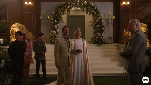 The other three begin to remember their gifts and mount a rescue for Eve and Flynn. They’re soon trapped however, but Eve encourages them to manifest the Library where they stand. It’s full of art, science, and magic and it values each Librarian. It lives in each of them and Flynn is the heart and soul of the Library. Nicole can only watch as the Library returns and her plan fails. While our heroes are back in the Library, Jenkins is still dead. But Flynn won’t give up; he has a crazy idea to rewrite history just enough. He jumps through a portal to the moment when Nicole will take the immortality potion and he begs her to help the Library. He cannot rescue her, but she is still the Library’s Guardian. She agrees and Flynn wakes up back at the tethering ceremony rehearsal, from the beginning of the season. He re-wrote everything that happened. Eve remembers, but the other three don’t. The couple asks Jenkins (who is alive, huzzah!) to perform the ceremony now, don’t wait for the solstice.