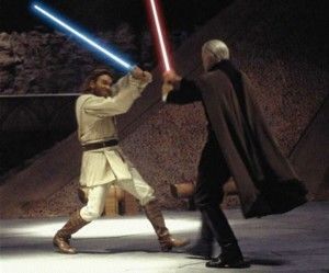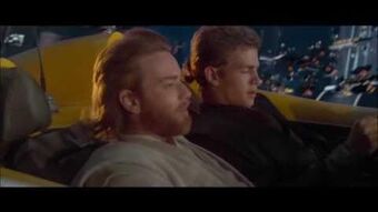 Takes place ten years after Phantom Menace, Anakin and Obi-Wan have grown as a Master-Padawan team and are assigned to protect Padmé Amidala, now a Senator after an attempt has been made on her life (the opening of the film). Anakin still puts his foot in his mouth and apparently has not lost his crush on Padmé. Obi-Wan cautions him, but Anakin is also distracted by dreams and visions he’s had about his mother. That is why they almost miss a bounty hunter sending a droid to put two worm creatures into Padmé’s room. Obi-Wan takes the quick way and jumps out the window after the droid (who’s reckless now?) Anakin chases after his Master in a speeder, weaving in and out of Courscant traffic. The bounty hunter shoots down the droid and Obi-Wan almost plummets to his death, but Anakin catches him. Then they banter back and forth a bit and Obi-Wan comments “if you spent as much time practicing your saber technique as you do your wit, you’d rival Master Yoda as a swordsman.” “I thought I already did.” “Only in your mind, my very young apprentice!”