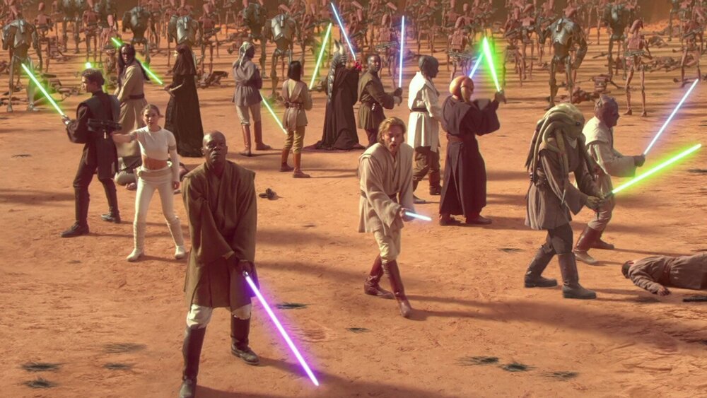 Luckily, Padmé firmly tells Anakin she is going after Obi-Wan, so if he wants to continue protecting her, as ordered, he will have to come with her. They find a droid factory on Geonosis and almost make it through, even R2-D2 and C-3PO get in on the action, but the couple is captured. They declare their love for each other, considering there is a good chance they’re going to die soon and share a kiss before taken into the large arena (sweeping love theme!) Obi-Wan quips they did a good job of rescuing him. Dooku announces that the three will be executed and three animals are released. Padmé quickly makes it to the top of her tower (cause she was smart and snuck a lock-pick into her mouth); she’s showing up the men. All three manage to get free, notwithstanding any injuries. But droids roll out. Countered by Mace Windu holding a purple lightsaber to Jango Fett’s throat, the cue for dozens of Jedi to enter.