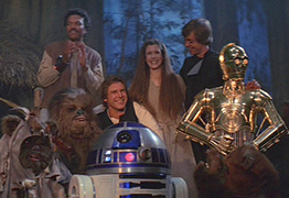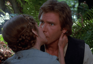 Chewie gets the men caught in a net (“always thinking with your stomach!”) and they’re surrounded by Ewoks as well. Who believe that 3PO is a god. And “it would be against my programming to impersonate a deity,” the fuss bucket tells Han. So Han, Chewie, and Luke are carted off to the village as well. Luke uses a Force trick to mimic “magic” and get the Ewoks to set them free before Han can be roasted for dinner. Leia and Han share a brief kiss and later, 3PO entertains the tribe with a brief retelling of their tale, complete with sound effects. This gains them membership into the tribe, and some help. Luke steps out and Leia follows. Luke reveals that he can sense Vader is near; Leia urges him to run away. He also reveals that Vader is his father and furthermore, the Force runs strong in his family; his father has it, he has it, and his sister. Leia muses that she had sensed a connection as well. Luke wants to try to save Vader; he can still sense good in him. They part with a kiss on the cheek. Which Han witnesses. But Leia can’t tell him what she’s learned, but begs for Han to hold her.