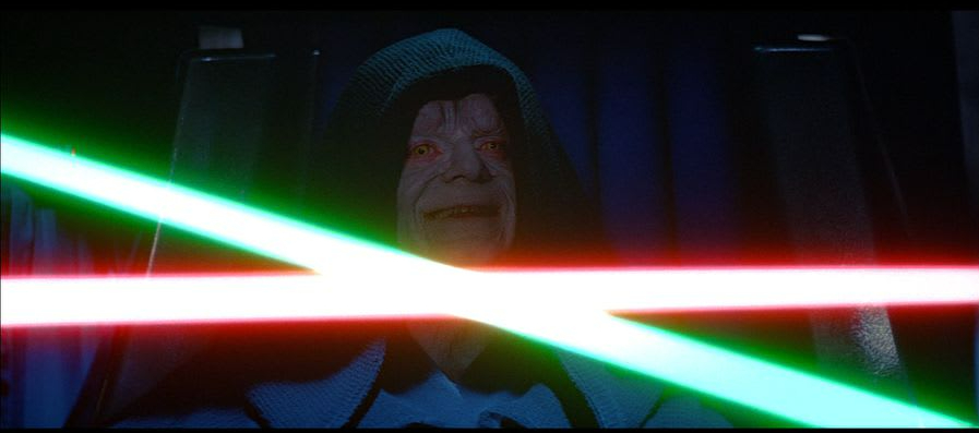 Luke can’t take more of watching his friends die, so he calls his lightsaber and aims for the Emperor. His blade crosses with Vader’s red one and the Emperor chuckles. Then begins another duel between father and son [and the best one of the original trilogy]. But Luke stops fighting his father. Vader doesn’t hold back long, even as Luke repeats he feels the conflict within. Eventually, his thoughts drift back to his friends, and to his sister. Vader was unaware there was a second child. Perhaps she will turn easier than her brother. This enrages Luke and he aggressively attacks, eventually knocking Vader down and slashing at him until he cuts off a hand. He sees the wires in Vader’s limb, similar to his. Palpatine laughs. Luke’s hate has made him powerful. Now, strike down Vader and become Palpatine’s new apprentice (see how loyal he is to Vader? He did this with Dooku, if you recall. This is the problem with the Sith, always backstabbing, completely untrustworthy the lot of them). “Never,” declares Luke and throws his lightsaber to the side (bad move). “You failed, your highness. I am a Jedi, like my father before me.” Palpatine cackles again and shoots lightning at Luke.
