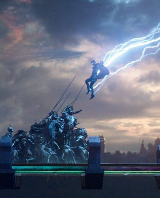Thor is losing the fight against Hela and she taunts him, “what were you the god of again?” Thor has a vision of Odin, who counsels him that Mjölnir was only a way for Thor to focus and control his power. And Asgard is the people, not a place. Thor fears he is not as strong as Odin; not, Odin tells him, Thor is stronger. This triggers lightning from Thor again and he blasts his sister (notice the pride on Loki’s face), and a repeat of the Immigrant Song. And a totally epic image of Thor smashing through the ranks with lightning. The heroes still struggle and Hela tries to stop the transport ship. Skurge jumps out from where he was hiding to take on the army, but Hela spears him.