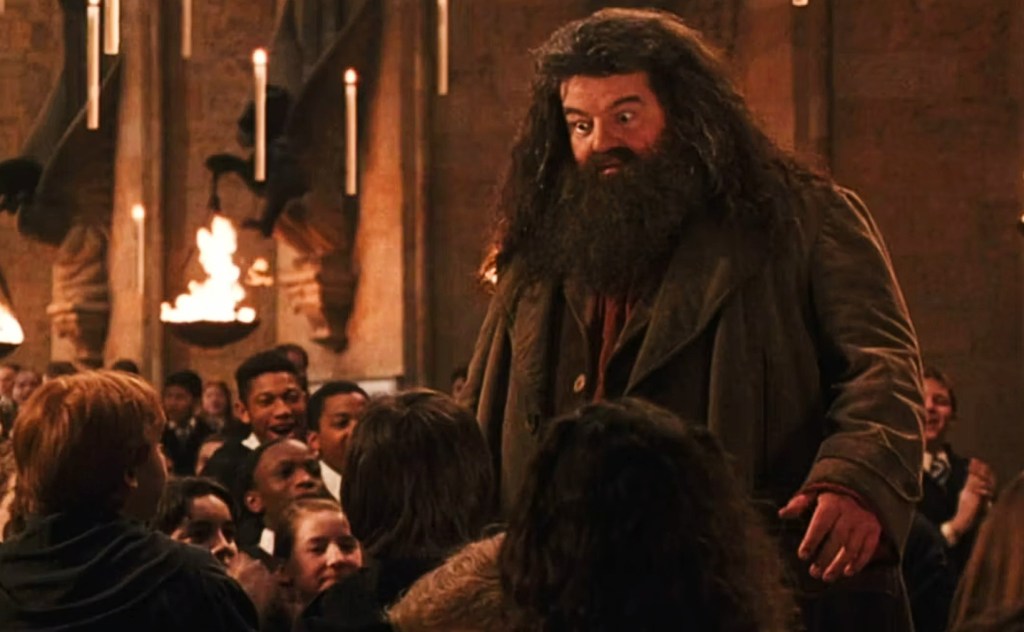 Everyone who was Petrified is revived. Hermione rushes to give Harry a hug, then awkwardly shakes hands with Ron. School exams are cancelled as a treat. And Hagrid returns to Hogwarts, stopping to thank the trio. Harry stands and tells the man, “there’s no Hogwarts without you, Hagrid.” [And I shed a tear watching this, remembering that Robbie Coltrane is no longer with us.] He hugs the man and Dumbledore is the next to stand and begins clapping [and that actor is no longer with us, either; he passed away before the film premiered]. McGonagall is the next to join in and soon most of the Great Hall is applauding Hagrid (accompanied with the sweeping theme from the ending of the first film).