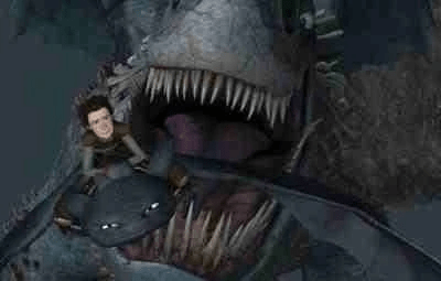 Toothless hears something and they soon find themselves in a herd of dragons all flying somewhere…their nest. Which is ruled over by a gigantic queen that eats all the food that the dragons bring back to her. And the occasional dragon as well. She’s as large as a mountain and almost captures our heroes, who manage to fly away in the nick of time. This complicates matters. Hiccup manages to stand up to Astrid and tells her he’ll come up with an idea because he won’t kill a dragon, but he’s also got to protect the other villagers from the gigantic dragon at the nest. Astrid punches Hiccup first for kidnapping her, then gives him a quick kiss on the cheek “for everything else.” (This echoes her finding Hiccup earlier and twisting his arm for the lies and then dropping her axe handle on him for everything else.) She stands by Hiccup’s side when he gets ready to enter the ring the next morning. He pleads that she keep Toothless safe in case the worst should happen to Hiccup.
