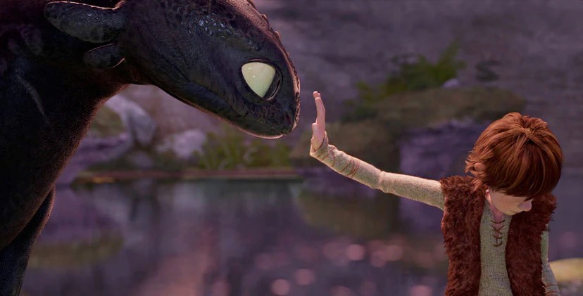 And in fact, Hiccup is out there, searching for the downed Night Fury. (Notice that the boy is left-handed.) What’s more, he finds the dark dragon. With his little dagger, he’s ready to kill the dragon and present its heart to his father, finally earning respect and acclaim. But the dragon’s green eyes pin on Hiccup for a minute, before closing and accepting its fate. After that, Hiccup can’t go through with it. He cuts the ropes that have entangled the Night Fury. The beast quickly pins him, once again glaring at the small lad. With a roar, he scares him, then takes off.