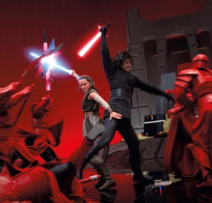Ben arrives (in an old TIE fighter) and faces off against the Knights of Ren. At first, armed only with a blaster (yeah, that’s Han Solo’s kid). But when it looks like Rey will strike down the Emperor, she instead passes Luke’s lightsaber (they managed to fix it at some point) to Ben. Now it’s an even match between him and the Knights. Rey then pulls out Leia’s saber and takes on the Red Guards. Ben makes his way to Rey’s side and they face the Emperor. “Stand together, die together,” he declares and sucks the life out of them, rejuvenating himself since they are more powerful as a dyad.